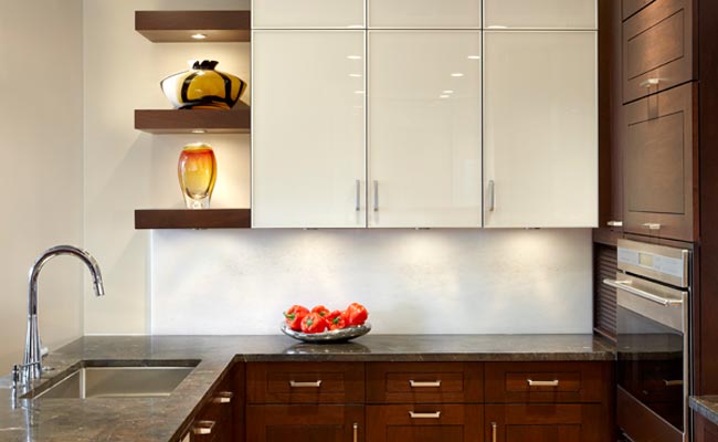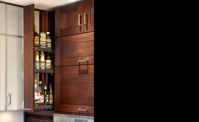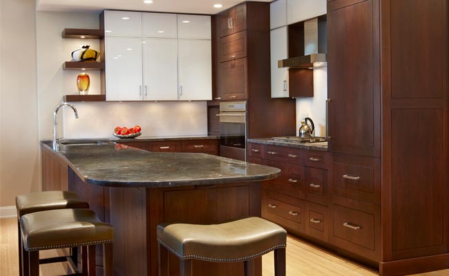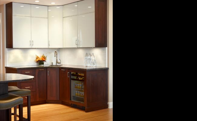 Plain & Fancy Cloister Full Overlay in Cocoa stain on Walnut wood. Upper cabinets in White glass with aluminum trim.